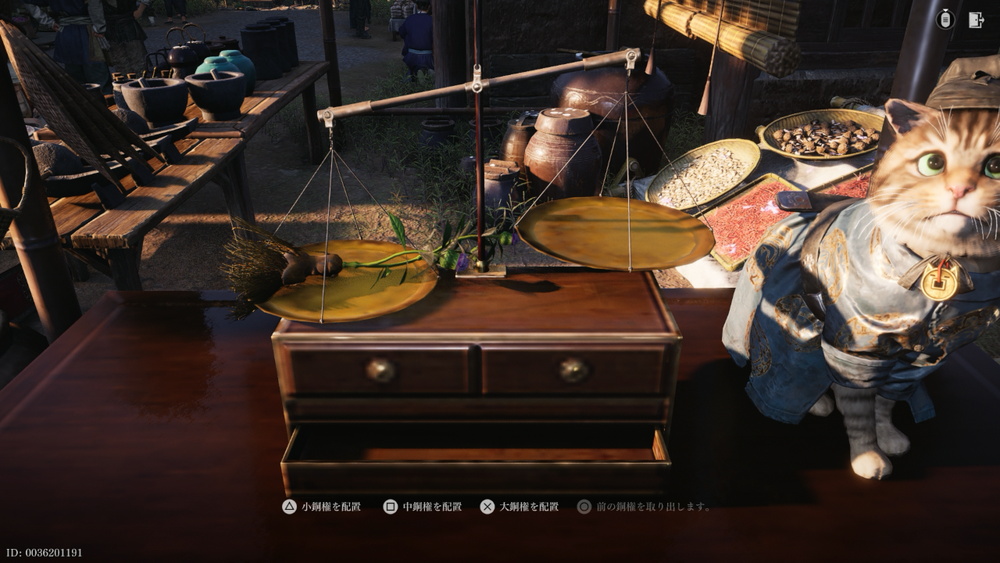 ミャオミの財宝 目次を表示清河鬼火収集開封東量西度万物に魂ありフィールド各地にいる猫の謎解き。 クリアすると専用商店用の通貨などが貰える。 清河 鬼火収集 開封 東量西度 ミャオミが乗っている机に近付いて「計量」を選ぶと開始。 左右の天秤を釣り合わせるのが目的。 取り消しができるので大きいものから順に動くまで載せていき、行きすぎたら取り消して軽いものを選び直すだけで良い。 万物に魂あり 開封城・開封府の北西側のエリアにある。 答えの供物は「肉付き骨」「紙凧」「一等功労犬」
